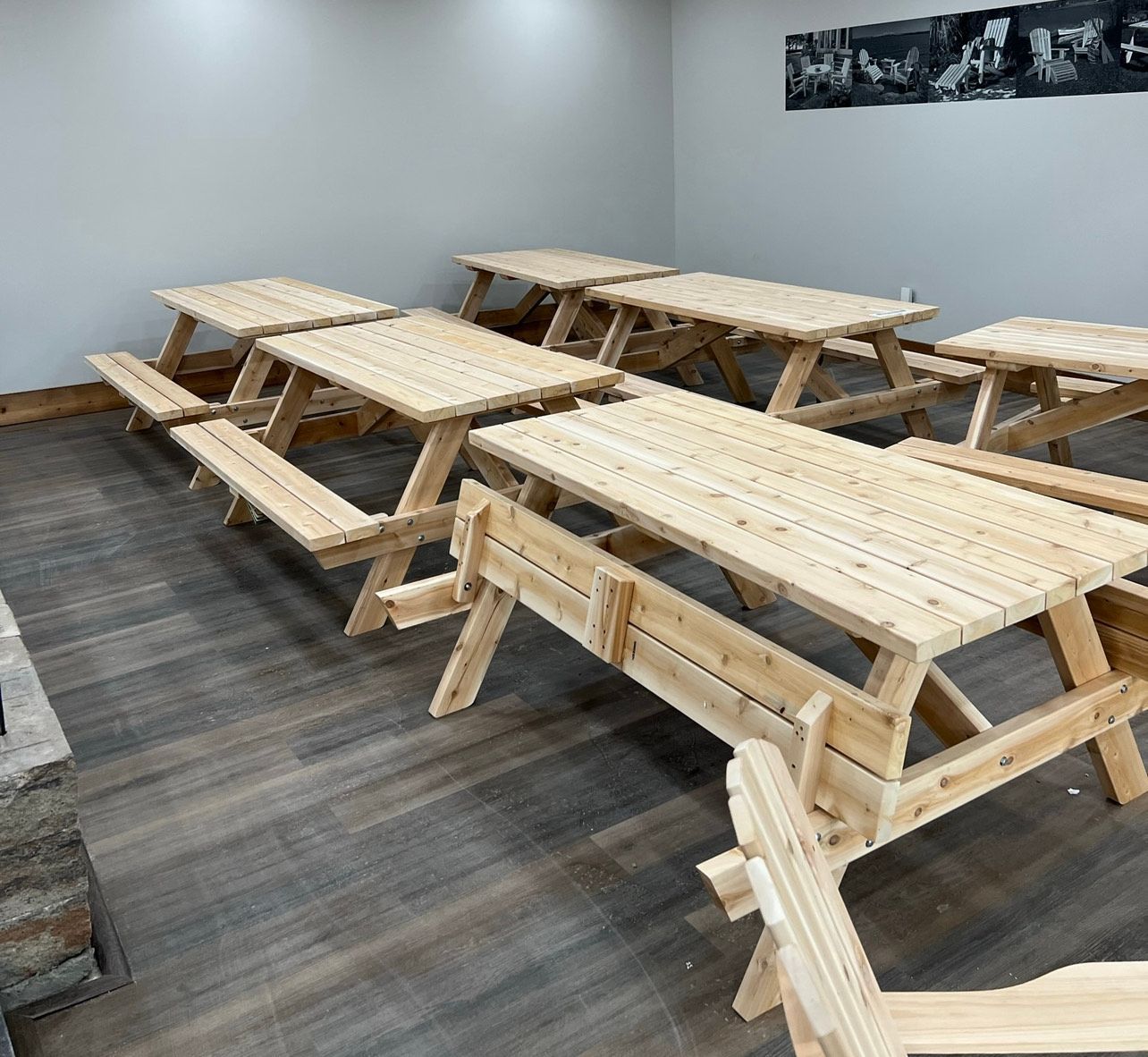 In addition to chairs, we also offer Adirondack-style picnic tables that are perfect for outdoor dining and entertaining. Our picnic tables are durable and sturdy, made with the same high-quality materials as our chairs, and come in a variety of sizes to accommodate different group sizes and space constraints.